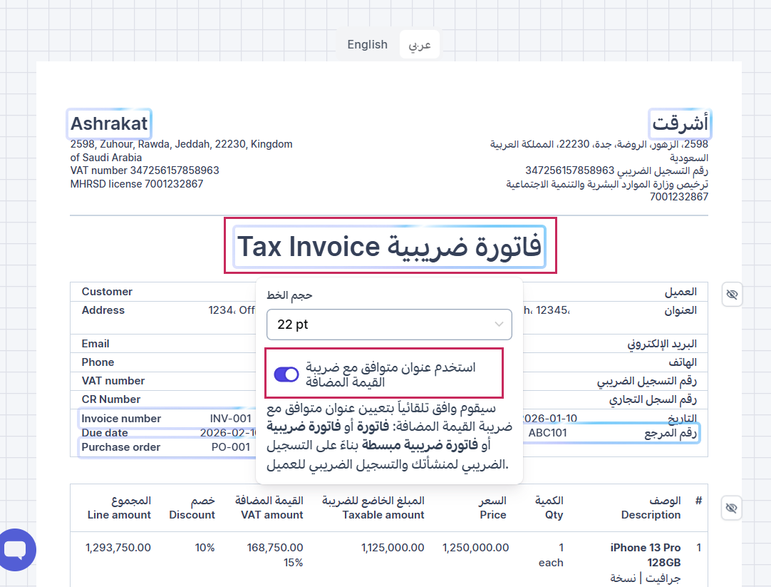 • ملحوظة: عنوان الفاتورة داخل شاشة إنشاء المستند مثل الفاتورة سيظهر دائمًا بشكل ثابت (مثل: فاتورة / إشعار دائن)، بغض النظر عن العنوان المحدد داخل القالب.