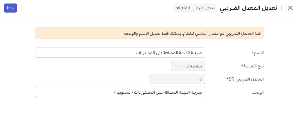 - لا يمكنك تعديل النوع (مبيعات/مشتريات) أو قيمة المعدل.