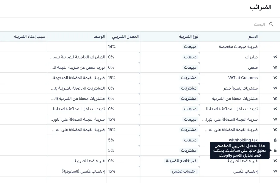 إذا لم يكن هناك أيقونة، فهذا يعني أن المعدل الضريبي مخصص، ويمكنك التحكم الكامل في تعديله.
