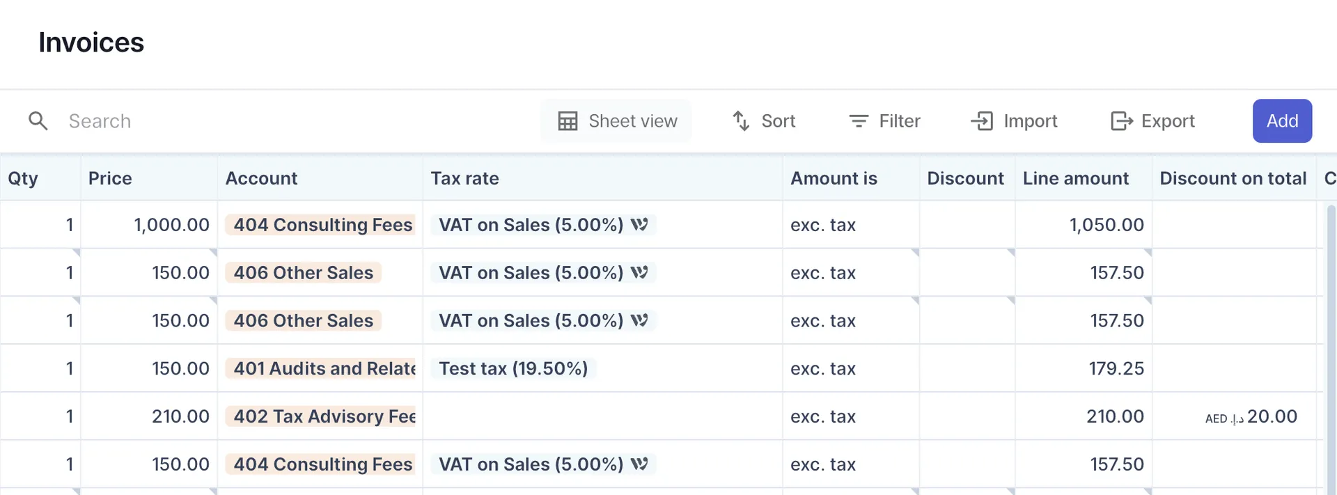 - When viewing invoices, credit notes, or bills, system tax rates will show with the Wafeq logo next to their name.